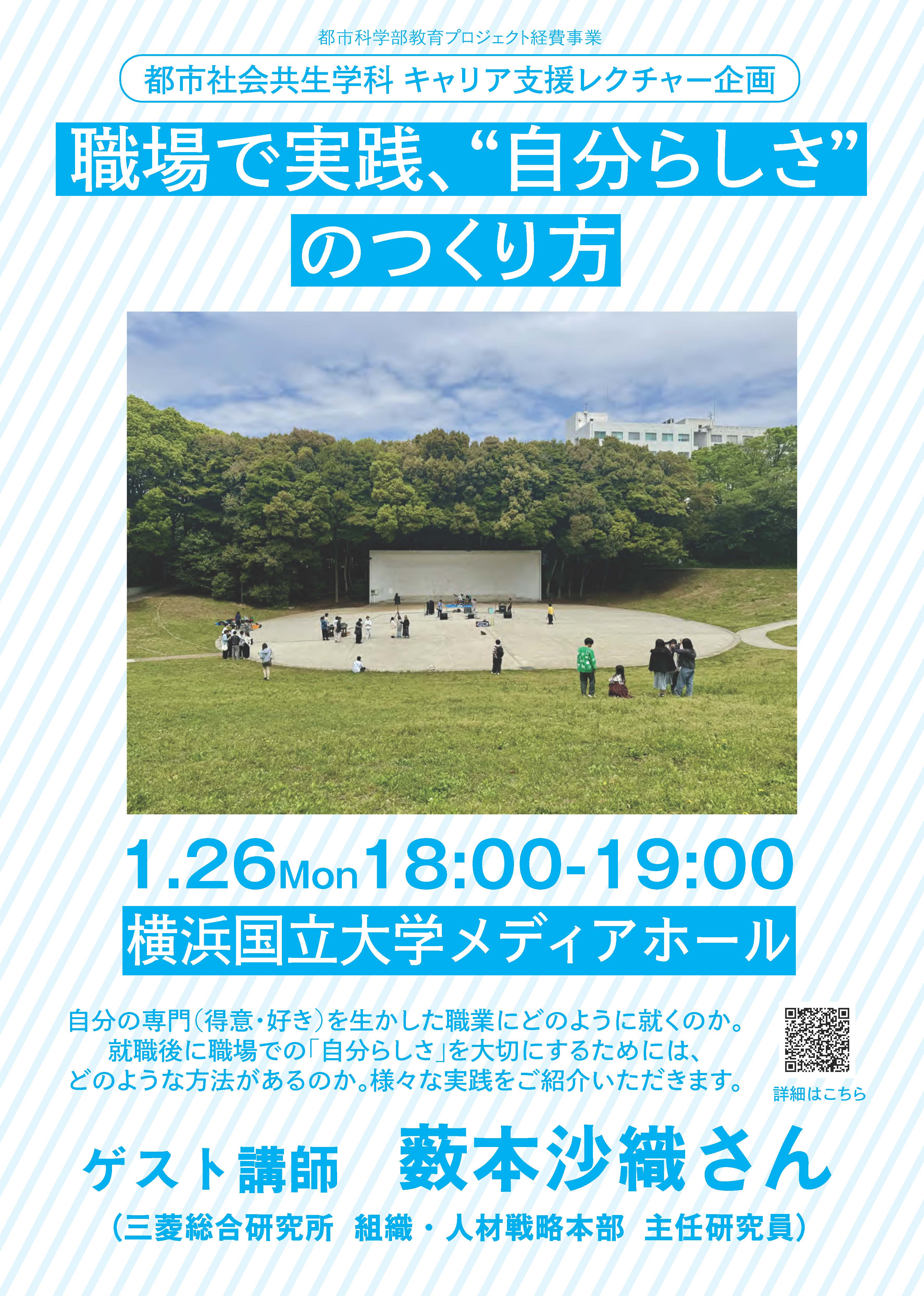 都市社会共生学科キャリア支援企画のレクチャー「職場で実践、”自分らしさ”のつくり方」(ゲスト:三菱総合研究所 組織・人材戦略本部 主任研究員の薮本沙織さん)を実施します。